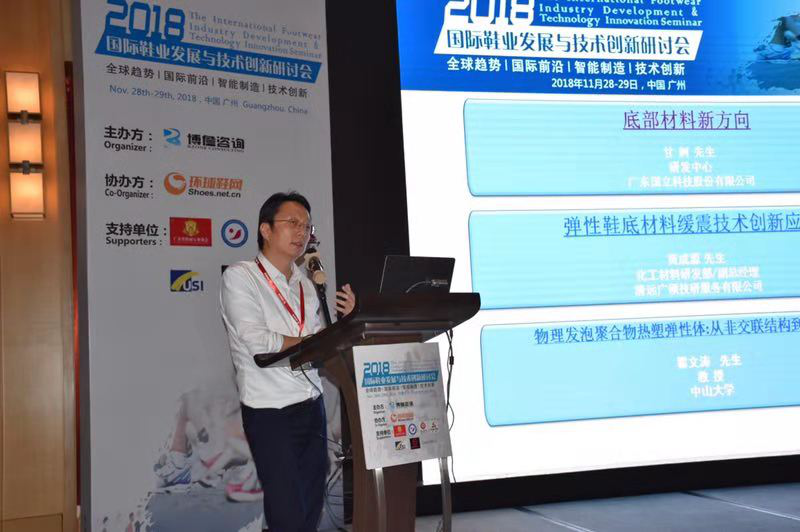 11月28日,由上海博詹商務咨詢有限公司主辦、環球鞋網協辦的2018國際鞋業發展與技術創新研討會在廣州召開。研討會上,廣東國立科技股份有限公司以“底部材料研究新方向”為主題作了主旨演講。