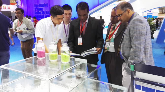 展會當天,道滘鎮委書記鄧濤等鎮領導到我司展位上進行參觀并指導,希望公司抓住“海博會”的宣傳力度,加大研發投入,加強技術攻關,加快上市步伐,積極創建國家高新技術企業,并借助“一帶一路”發展戰略將環保改性橡塑新材料推向世界!